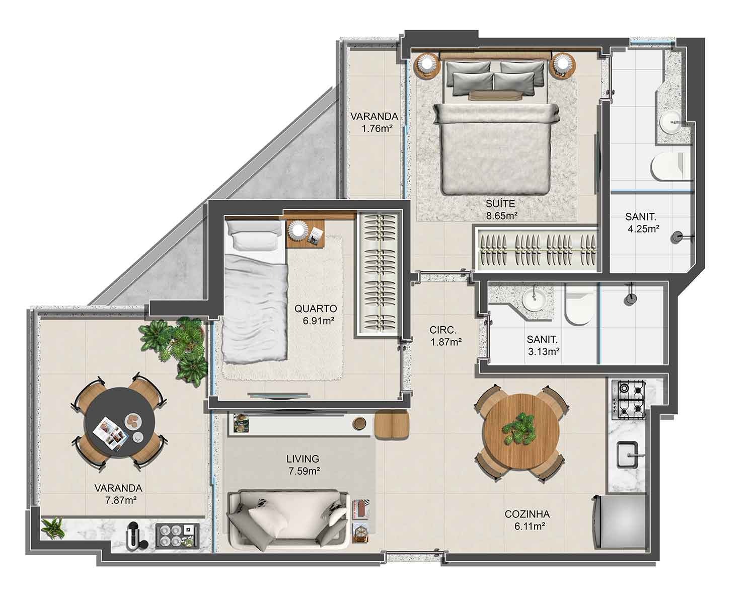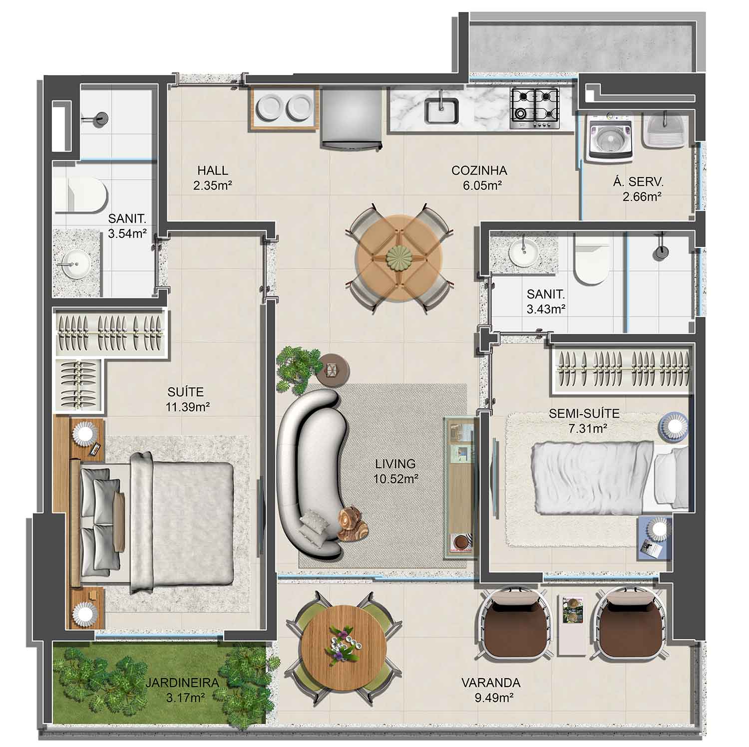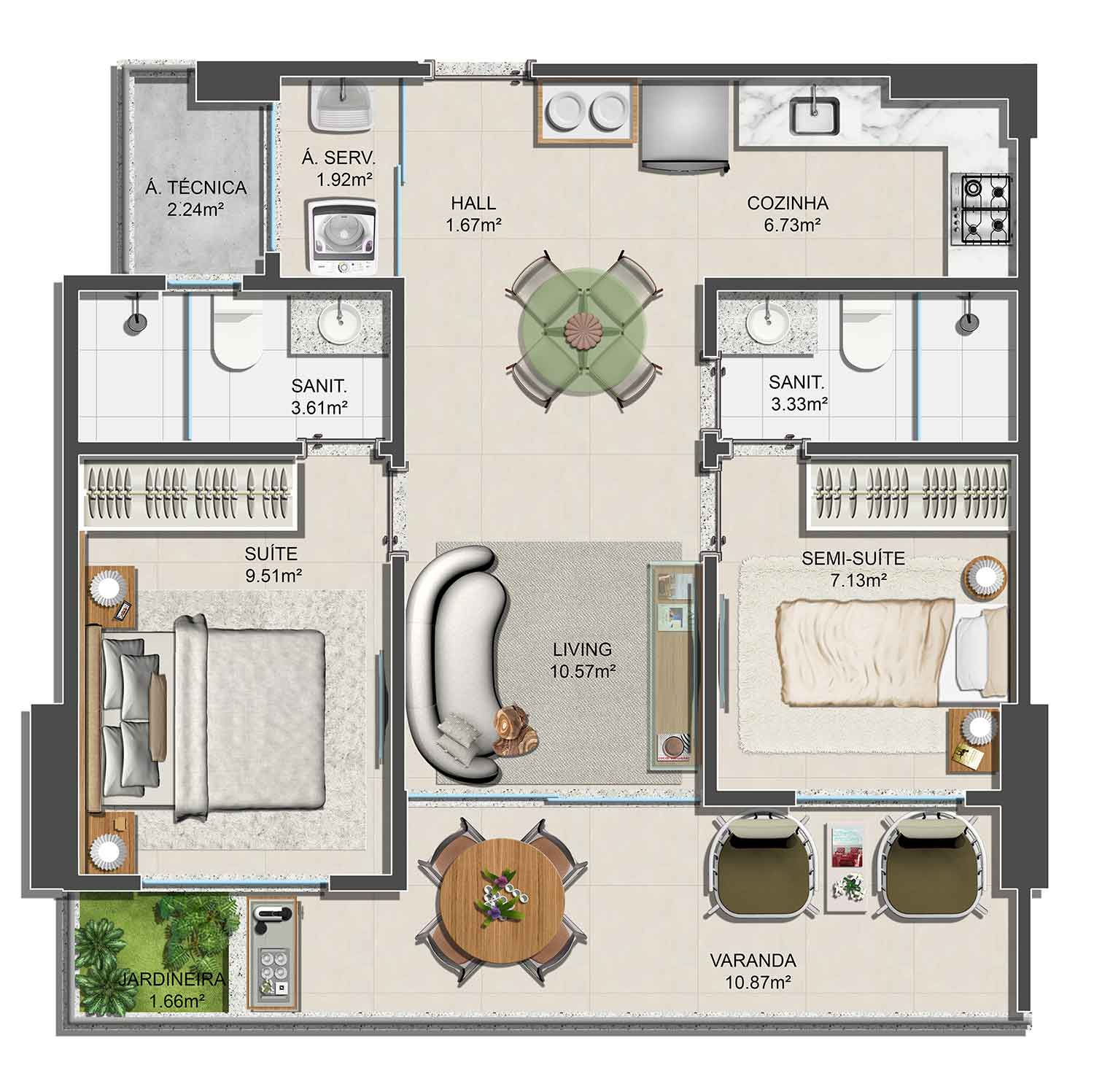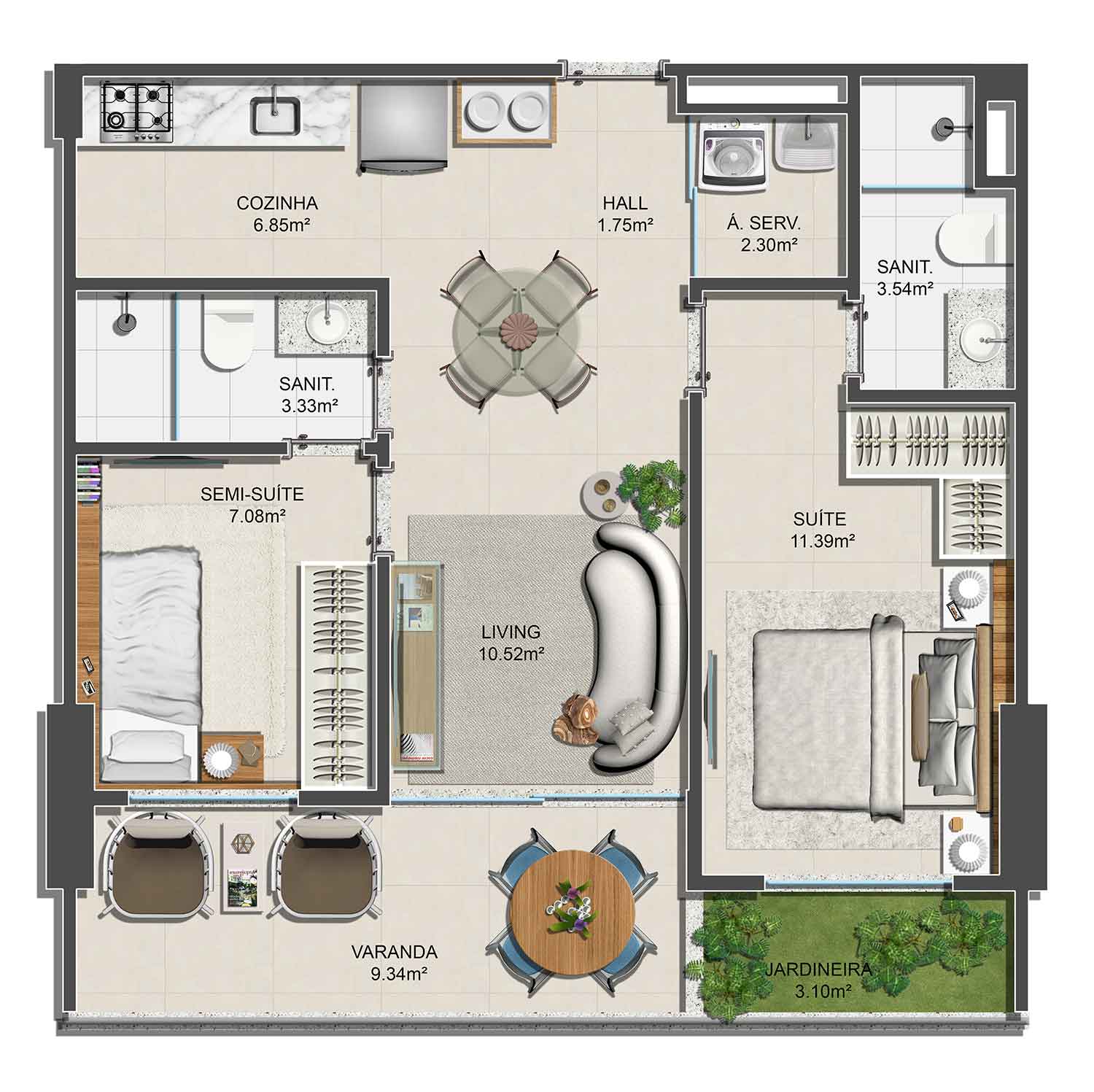 São apartamentos de 02 suítes com varanda, com 48m² e  59m² em um condomínio moderno, com uma infraestrutura completa de lazer garantindo qualidade de vida para todos os membros de sua família.